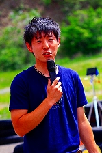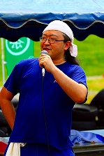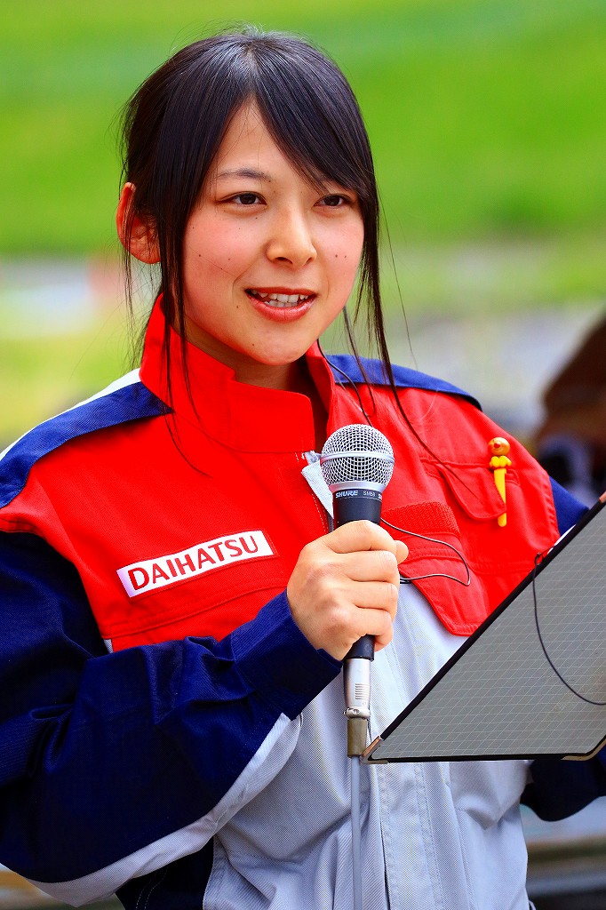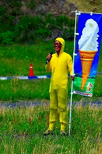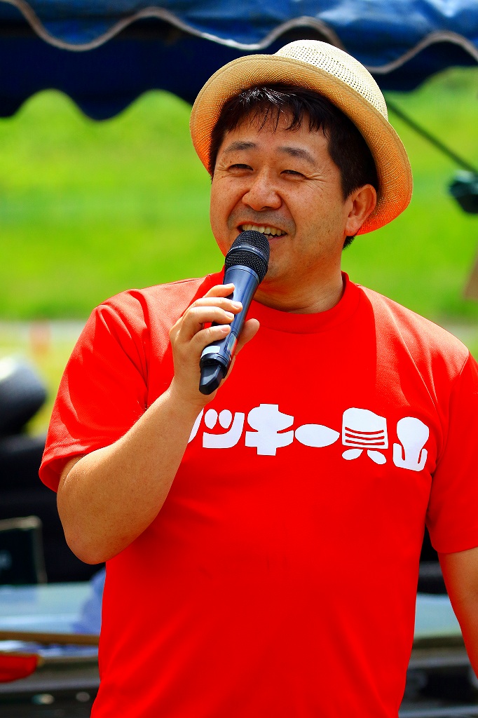 開会式に登場したのは、(左)旗やルールの説明で登場したスターターの大橋史佳、(中)実行委員長の兵藤忠彦(713R's GARAGE)、(右)司会のDJワッキー貝山