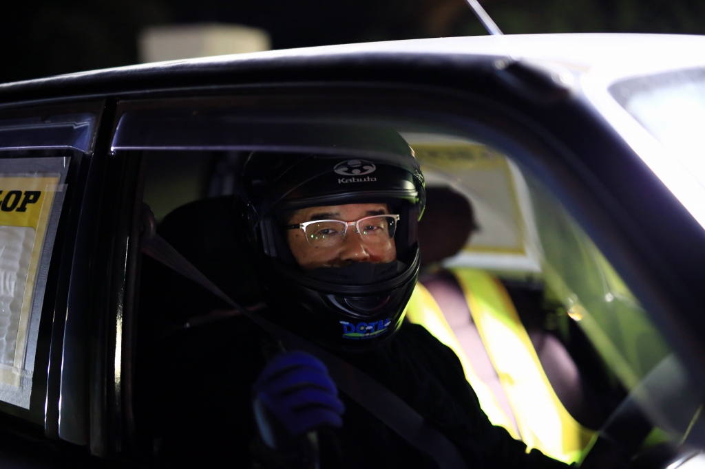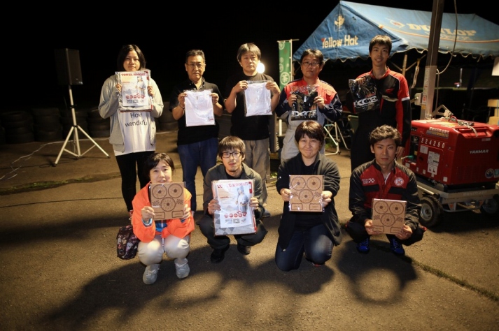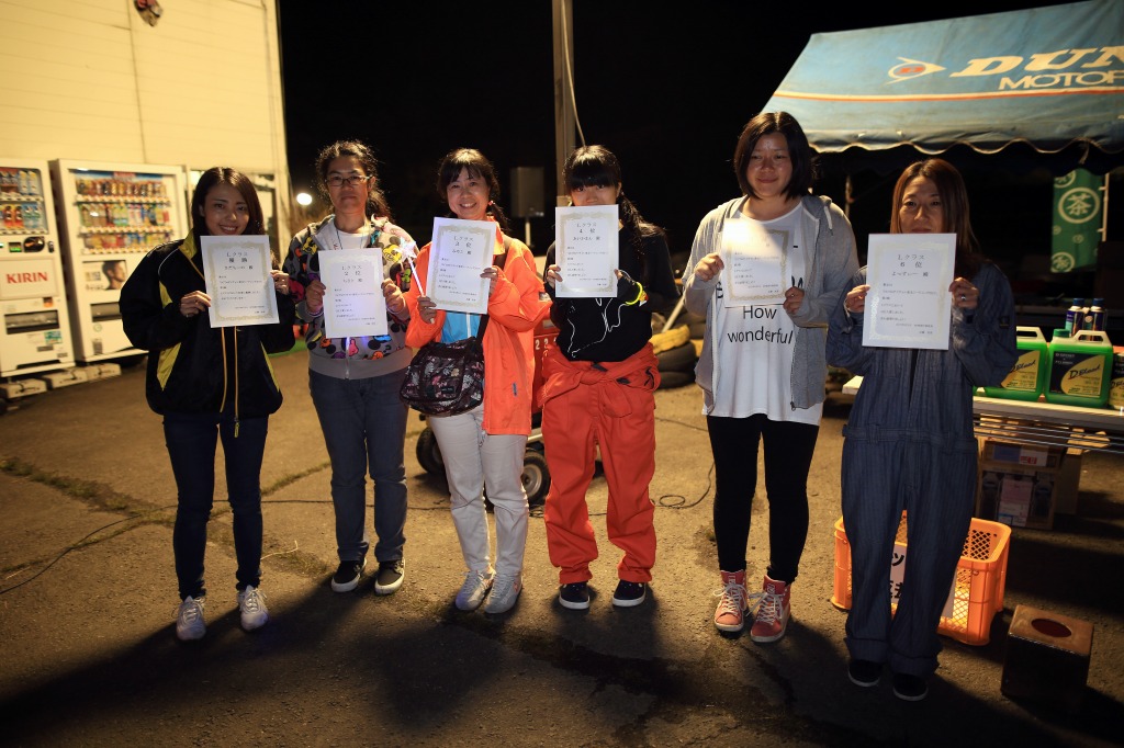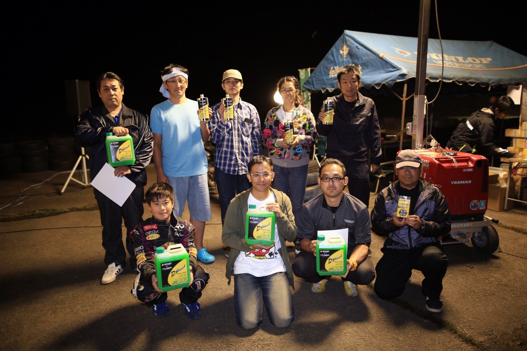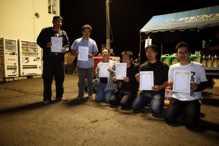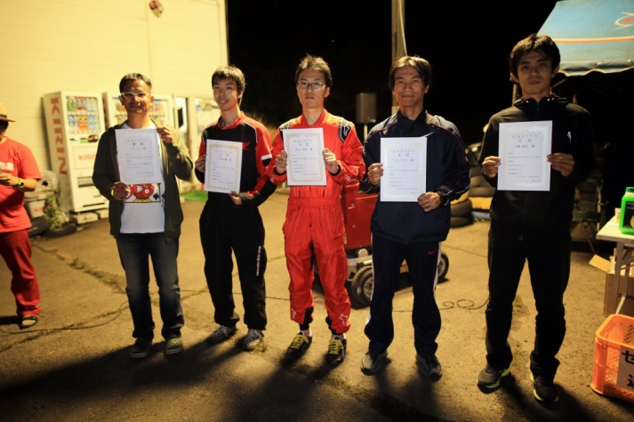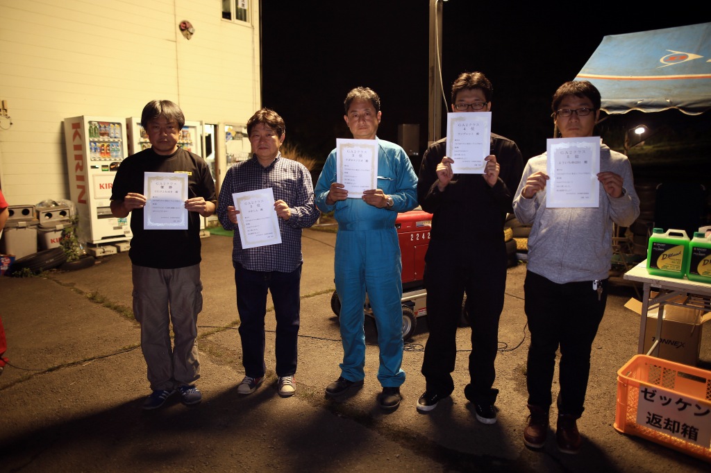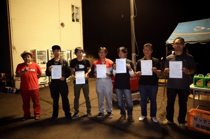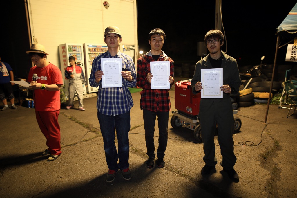 前回までサスセッティングに苦しんでいたカプチーノの三浦勇紀(1番左)、直前のサーキット走行でクラッシュというトラブルを乗り越えたか、それとも吹っ切れたか、第1・第2ヒートのデイステージでのブッチギリタイムで、コンスタントに好タイムを積み上げた2位ぐりふぃん(左から2番目)を振り切って優勝!